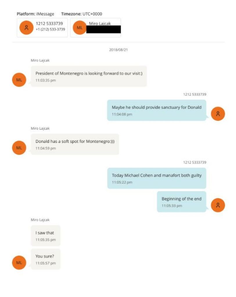 Epstin onda Lajčaku piše da su nekadašnji advokat predsednika Sjedninjenih Američkih Država (SAD) Donalda Trampa, Majkl Koen i bišvi Trampov savetnik Pol Manafort „obojica krivi“ i napisao „početak kraja“.