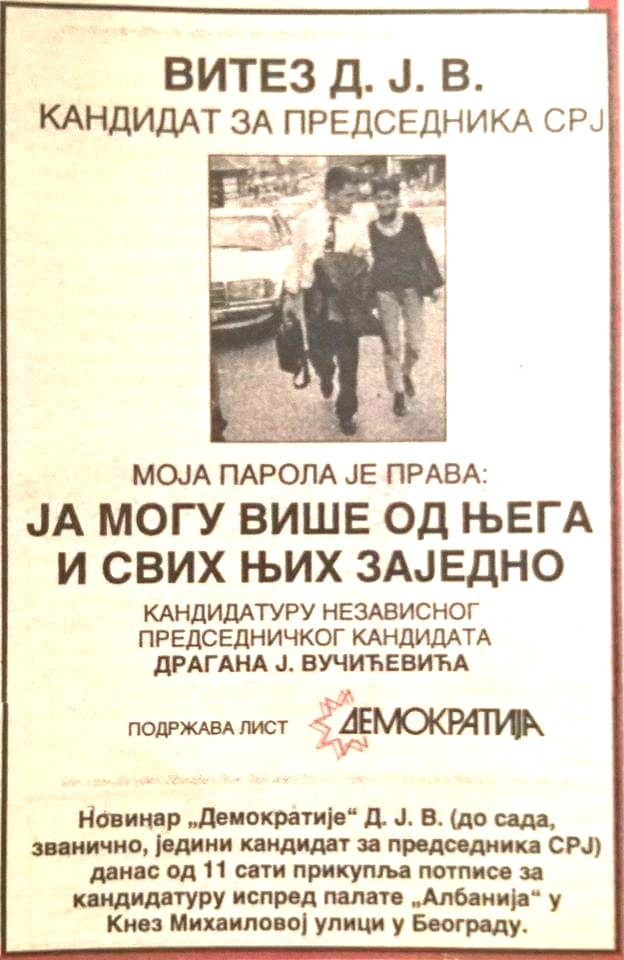 Predatoriše i dalje Di-Džej, krajnje neviteški. Inače, reklamiran kao žuti vitez lista ,,Demokratija“- za neke izbore.