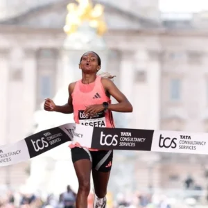 Tigst Asefa postavlja svetski rekord. FOTO: Tanjug/AP Photo/Ian Walton Asefa je danas oborila sopstveni svetski rekord (2:15:50), koji je postavila prošle godine na maratonu u Londonu. Drugo mesto na ovogodišnjem maratonu u Londonu osvojila je Helen Obiri iz Kenije (2:15:53), dok je treća bila njena sunarodnica Džojsilin Džepkosgei (2:15:55). Svetski rekord u muškoj konkurenciji iznosi 2:00:35, a postavio ga je Kenijac Kelvin Kiptum Čerijot u Čikagu 2023. godine.