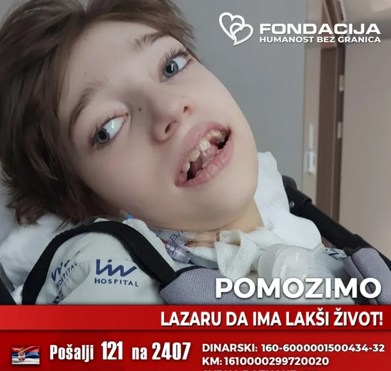 Lazar Lazarević je dečak rođen 2007. godine u Smederevskoj Palanci. Na svet je došao carskim rezom, ali tokom porođaja dolazi do teške hipoksije – nedostatka kiseonika u mozgu, koja ostavlja ozbiljne i trajne posledice, navodi Fondacija Humanost bez granica.