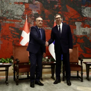 Predsednik Švajcarske Gi Parmelan i predsednik Aleksandar Vučić. Foto: Tanjug/Dejan Živančević Predsedniku Švajcarske priređen je svečani doček, uz intoniranje himni dveju zemalja i počasni stroj Garde Vojske Srbije. Parmelana su zajedno sa predsednikom Vučićem dočekali i ministri u Vladi Srbije Nemanja Starović, Bela Balint, Jagoda Lazarević, Aleksandra Sofronijević. Nakon svečanog dočeka uslediće tet-a-tet sastanak Vučića i Parmelana, a u 10.45 časova predviđen