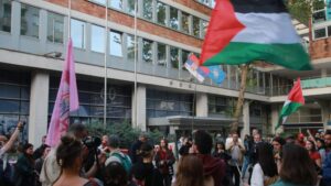 Okupljeni nose transparente sa natpisom “Nema pesme za aparthejd “, “Slobodna Palestina”, “Naš pRoTeSt”, “Javni servis za Javni interes”, “Izraelska vojska je za dve i po godine ubila 300+ medijskih radnika”, “Nećemo ELBIT”, “Ne u naše ime”, “Izrael je napao zgradu javne iranske televizije usred programa”. Nose i zastave Palestine i zborova građana. A post shared by Mašina (@masina.rs) Protest je podržao i Savez komunističke omladine Jugoslavije, čini pripadnici